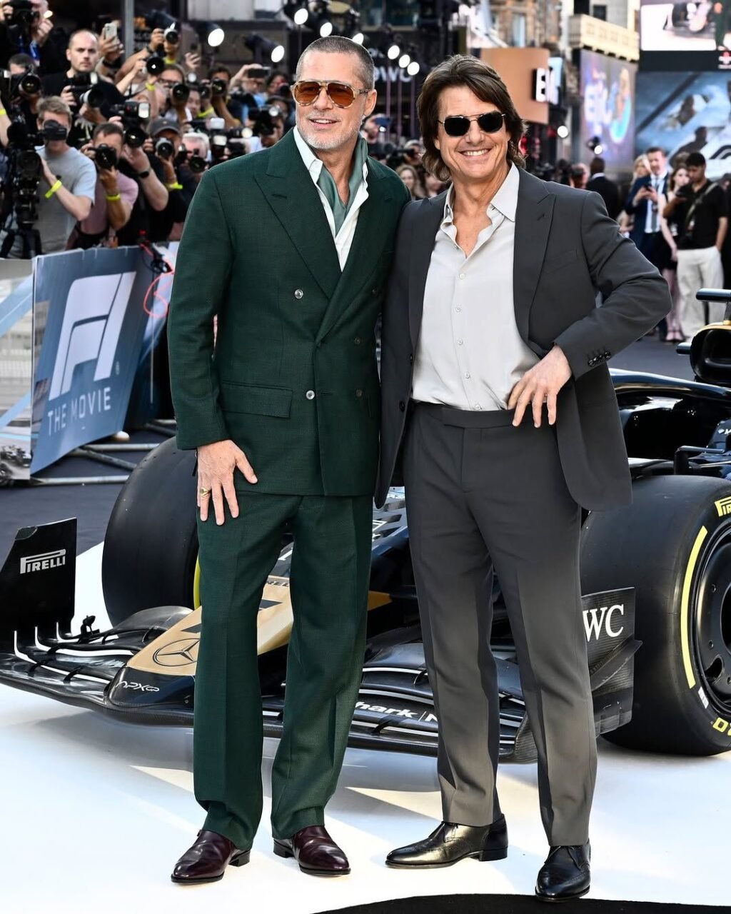 Pitt, meanwhile, continued his cool-guy fashion streak in a vintage-inspired suit by the Saville Row tailor Anderson & Sheppard. The F1 star wore a double-breasted coat and tapered dress pants, which he paired with a silk ascot scarf tucked underneath a white Oxford. Aviator glasses—a staple of Pitt’s F1 press style—and leather boat shoes tied everything together.