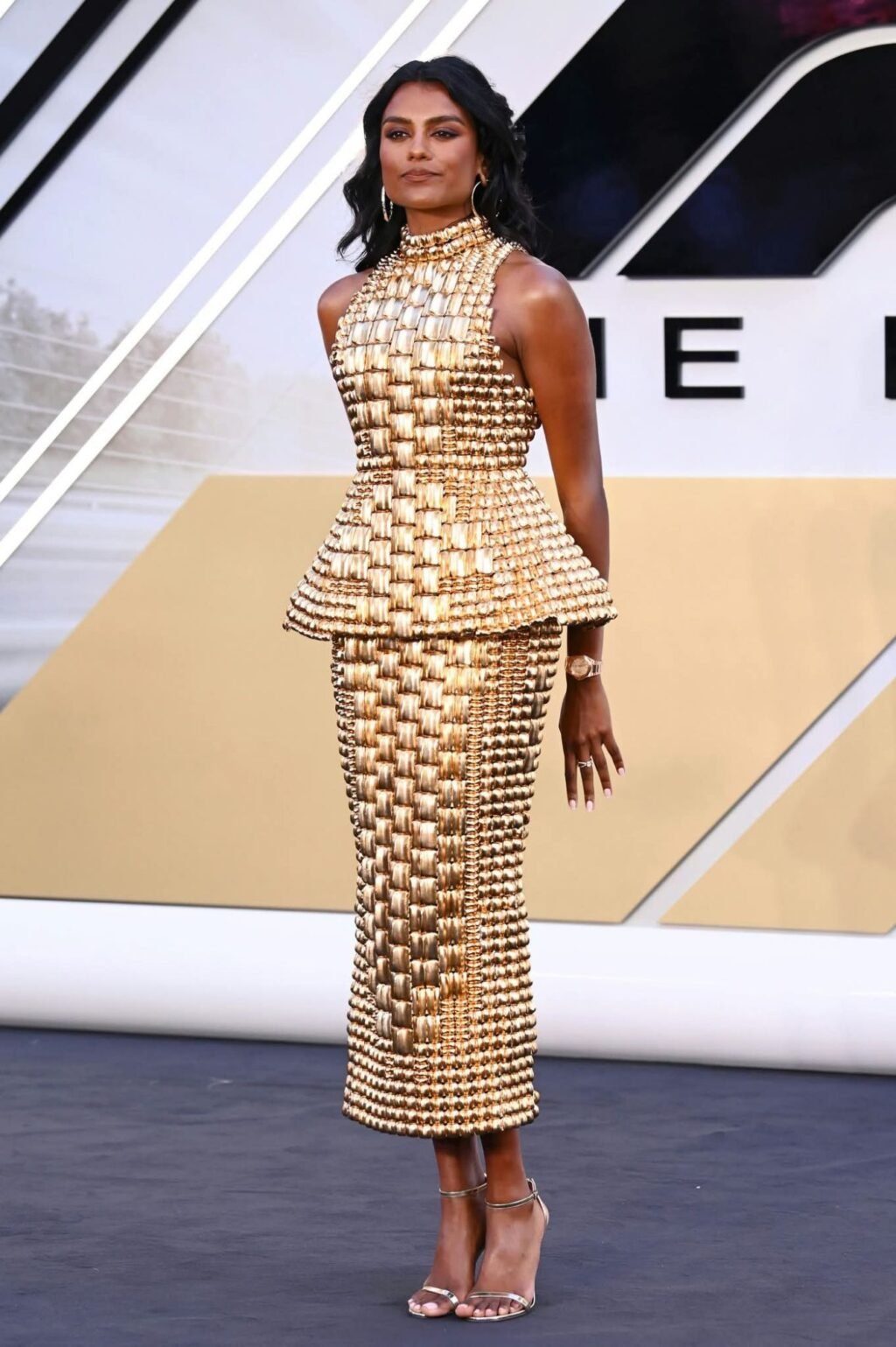 Trust Simone Ashley to breathe new life into a silhouette once written off as passé. The star arrived at the F1: The Movie premiere this evening in London in a dramatic metallic look that hinged on its flared waistline—a detail that winked at the early 2010s peplum trend, but with a bold, unexpected twist. Ashley hit the red carpet in a gold sleeveless look from Balmain’s fall 2025 collection, complete with a sculptural, molded bodice and a peplum that jutted out like armor. The piece struck the perfect balance between nostalgia and edge, trading the printed, often ruffled peplums of yesteryear for one that spoke through its fabrication. Ashley’s dress was designed in a 3-D woven technique that mimics the appearance of crocodile skin. Paired with tousled curls, glowing skin, and minimal gold jewelry, Ashley proved that the once-polarizing peplum can feel not only modern, but also downright futuristic when done correctly.