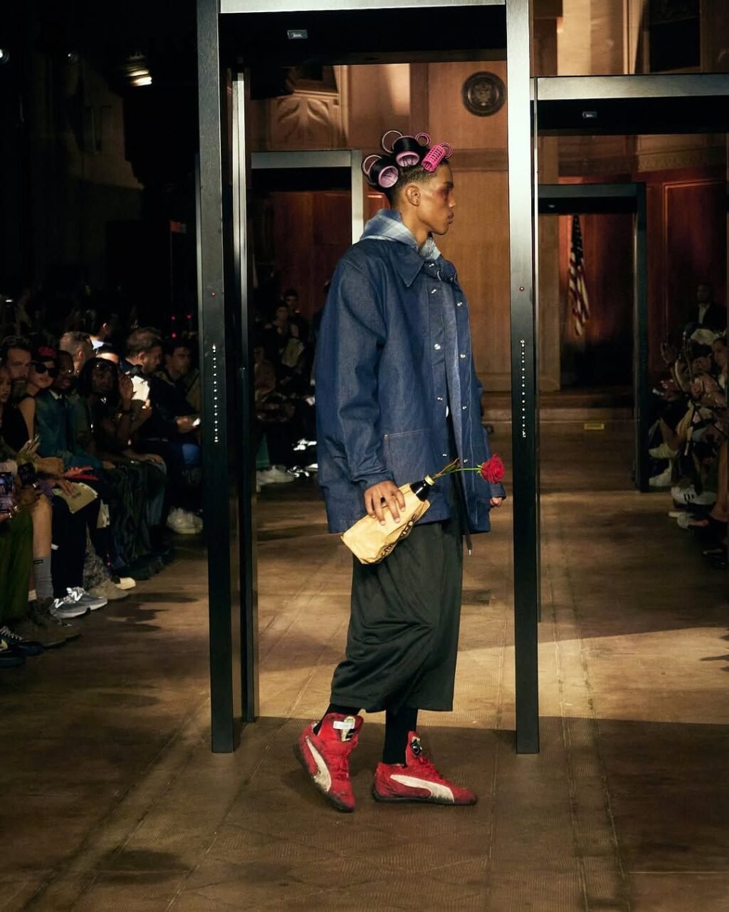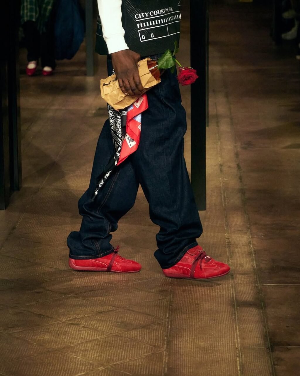 Hostd in a raw and contemporary setting, the AWGE SS26 show in Paris brought together an eclectic crowd of fashion insiders, celebrities, rap game figures, and longtime fans. The show, like Rocky, was a crossroads between artistic performance and stylistic manifesto. From the very first silhouettes, the influence of urban culture and the 2000s was felt, but with the highly discerning touch of a designer who masterfully handles contrasts: oversized shapes versus sleek structures, patinated leather versus technical materials, monochrome enhanced with vibrant touches.
