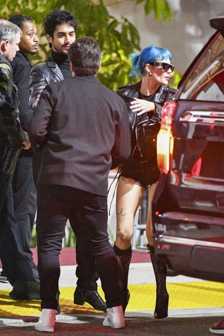 Halsey, sporting bold, bright blue hair, wore black denim mini shorts, a matching T-shirt, and a cropped biker jacket. Going for a monochrome look, she complemented her outfit with heels, sheer knee-high socks, and structured Chanel sunglasses. Jogia, meanwhile, wore black skinny jeans and a leather coat of his own design.