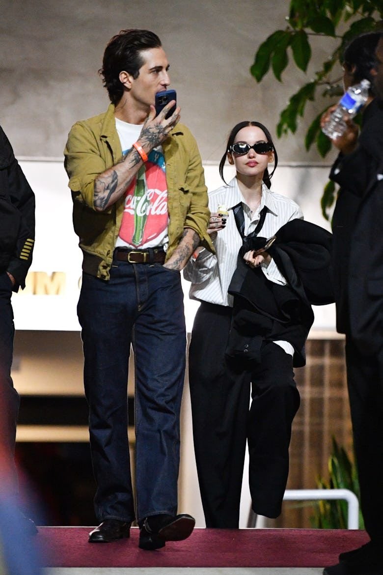 Celebrities graced the runway for Lady Gaga’s four-night runway show at the Kia Forum in Los Angeles. After a glamorous opening night, which featured the likes of Chappell Roan, Olivia Rodrigo, and Addison Rae, the second night kept the party going. Tuesday’s notable guests included Dove Cameron and Italian rock star Damiano David, who showcased their signature, on-trend couple style. Cameron and David, who have been dating since fall 2023, were spotted leaving the venue wearing classic menswear with a sleek twist. Cameron opted for a striped cropped shirt and wide-legged pants. The pop singer paired her Office Siren pieces with a patterned black tie. But instead of properly cinching it, she let it hang loose, mimicking the wave of untied ties seen recently on the runways of brands like Dior and Schiaparelli. Cameron completed her look with cat-eye glasses, a slicked-back hairdo, and a black coat, which she held in her arms.