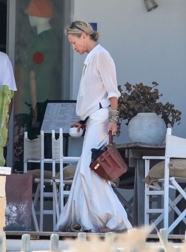 Before heading to the beach, Moss was spotted wearing a long silk skirt to cover up, her hair pulled back in a low bun. She nearly spilled the contents of her Kelly bag as she held it so casually in her hand.