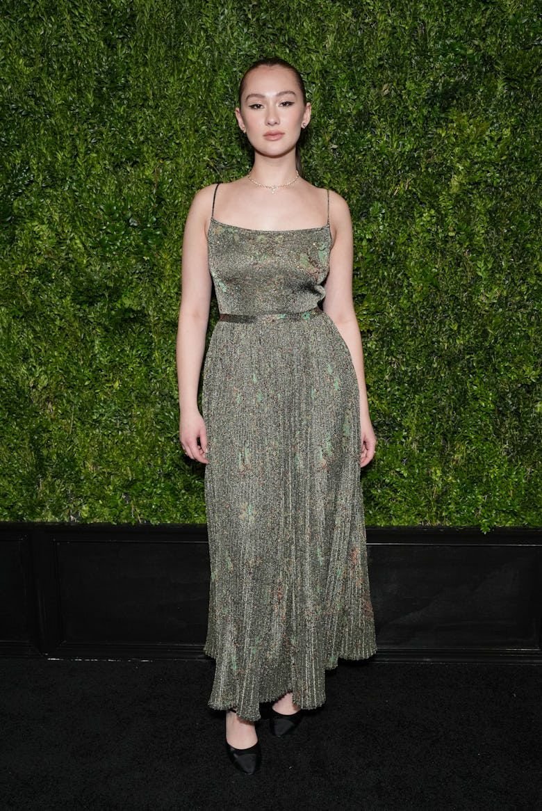 The actress leaned into her dressier side for a Chanel 2025 dinner, wearing a shimmering spaghetti strap look from the French brand, paired with minimalist accessories and satin heels.