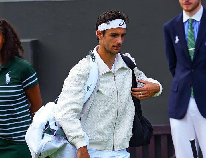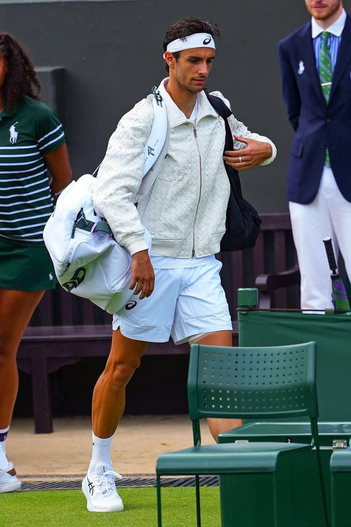 At only 23 years old, Musetti embodies this new generation of athletes capable of combining grace and determination, technique and aesthetics. With Wimbledon in full swing, the announcement of his partnership with Bottega Veneta has landed like a bombshell in the heart of the fashion and sports world. And for his grand entrance onto center court, facing the formidable Nikoloz Basilashvili, the young Italian didn’t just shine with the quality of his game. He captivated everyone’s attention by appearing dressed in an immaculate version of Bottega’s famous woven leather jacket, redesigned to meet the rigorous requirements of the London tournament’s famous white dress code. An outfit that borders on perfection: bold yet regulatory, innovative yet respectful of tradition. A demonstration of style as much as an act of strategic positioning, which testifies to the finesse of the collaboration between the athlete and the brand.