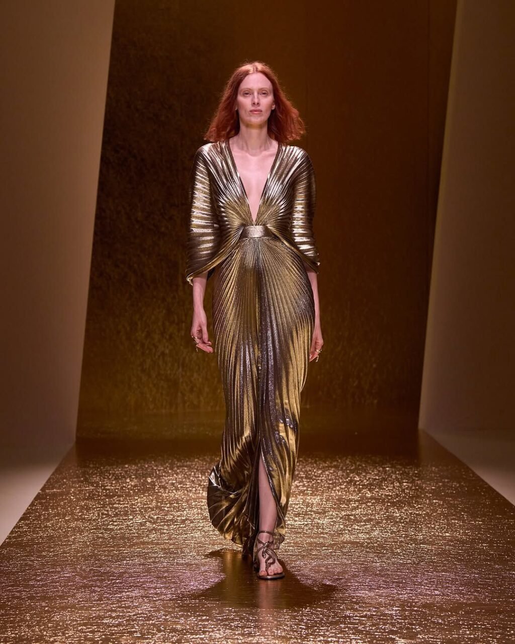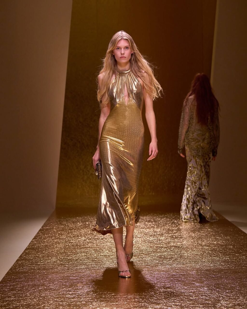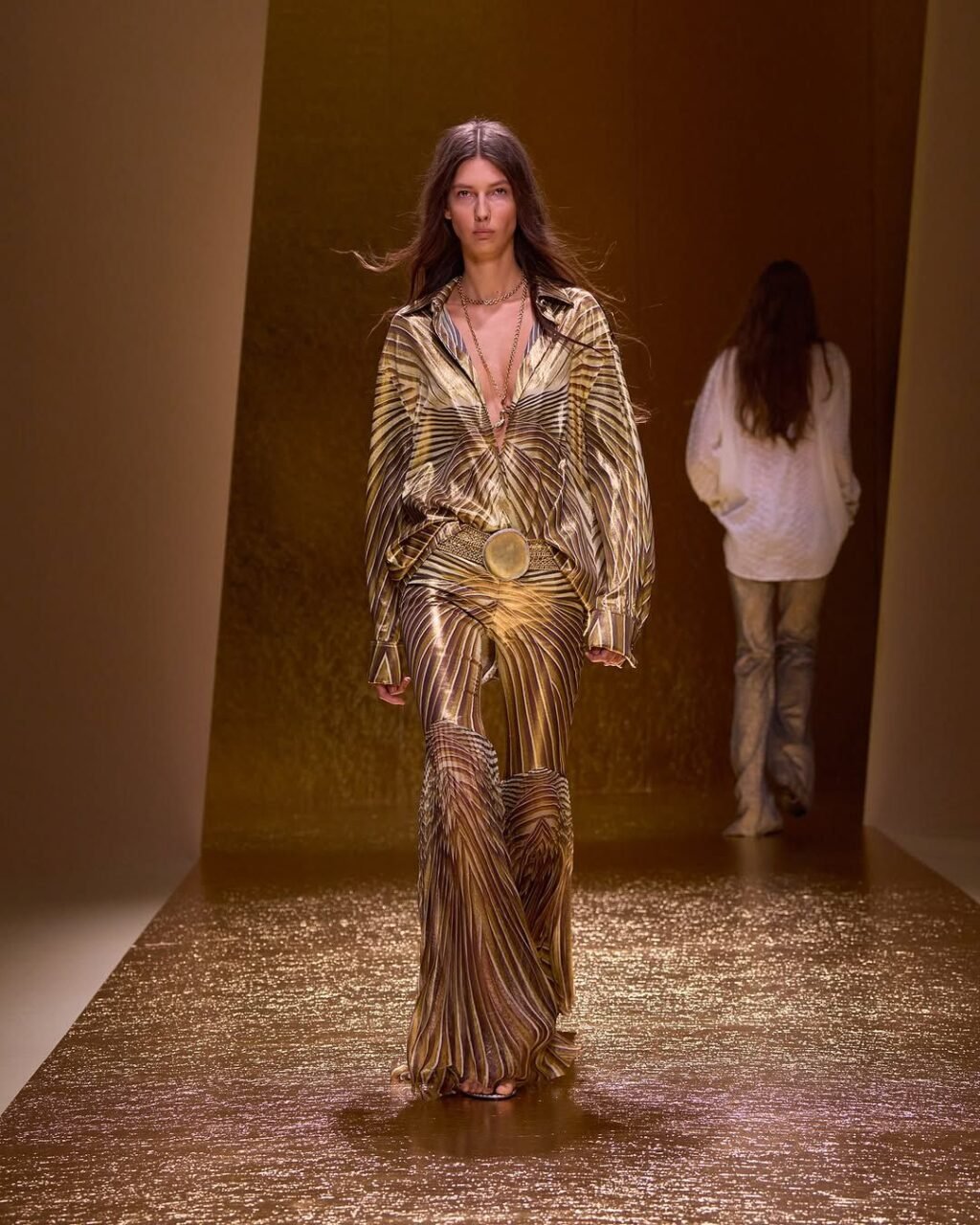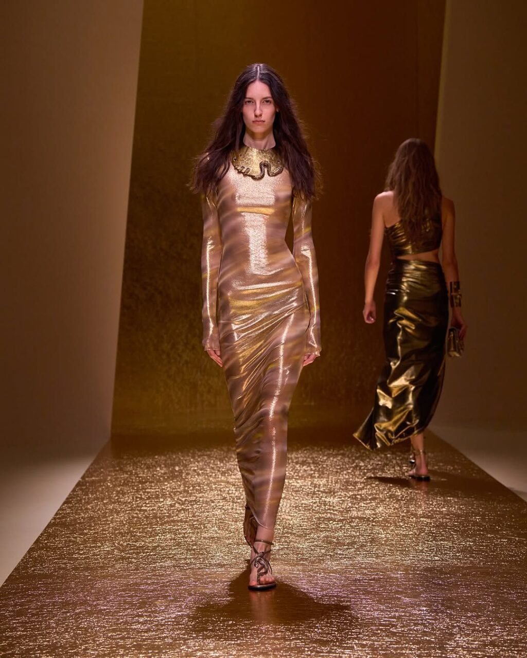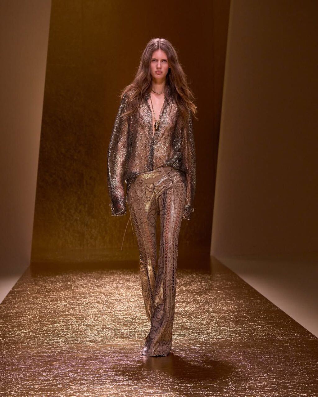 This season, gold emerges as the unifying thread. More than just a color, it symbolizes power, obsession, and seduction. Each piece walks the runway as a statement of confidence and self-assertion, staying true to the Cavalli DNA while reimagining it through a contemporary lens. Puglisi skillfully merges the brand’s glamorous, untamed spirit with a dramatic elegance that carries his unmistakable signature.